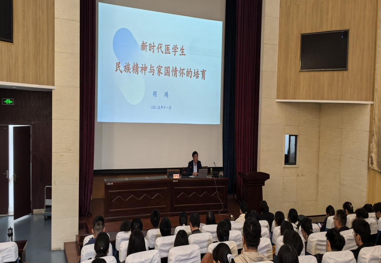 胡鸿指出,民族精神是医员工攻坚克难的精神支撑,家国情怀是医者仁心的本质底色。他还通过多名皖医先辈的事迹阐释了“大医精诚”和“家国大义”的关联,引导全体青年学子,要在专业学习中坚定理想信念,在实践历练中强化使命担当,以过硬的专业素养和深厚的家国情怀,为守护人民健康、推动医药卫生事业进步贡献青春力量。